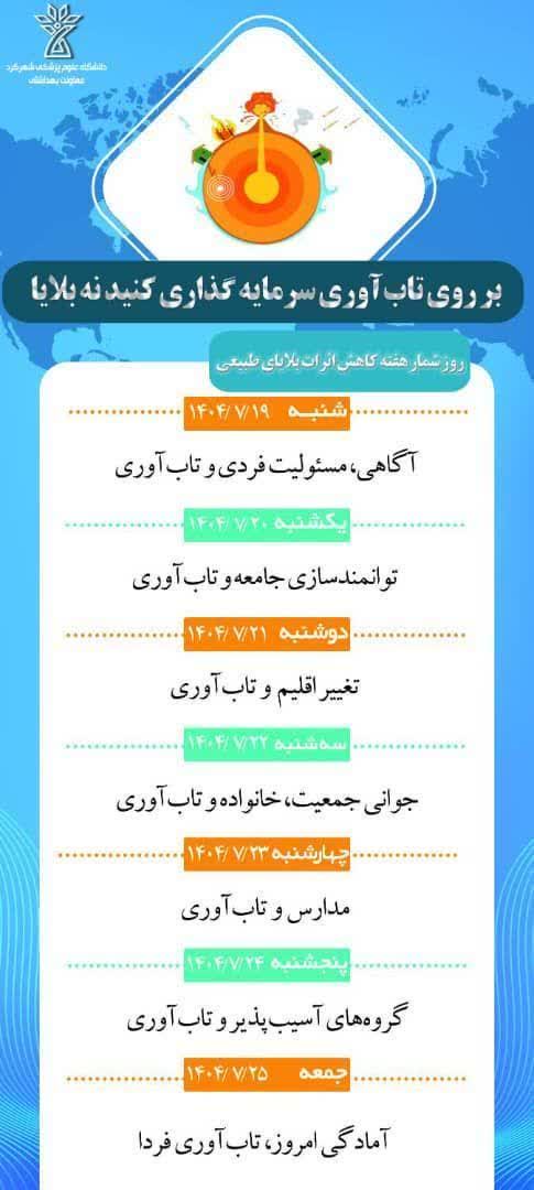 ۱۹ الی ۲۵ مهر ۱۴۰۴؛ هفته ملی کاهش خطر بلایا شعار هفته ملی کاهش خطر بلایا در سال ۱۴۰۴: بر روی تابآوری سرمایهگذاری کنید نه بلایا شنبه ۱۹ مهر: آگاهی، مسئولیت فردی و تابآوری |