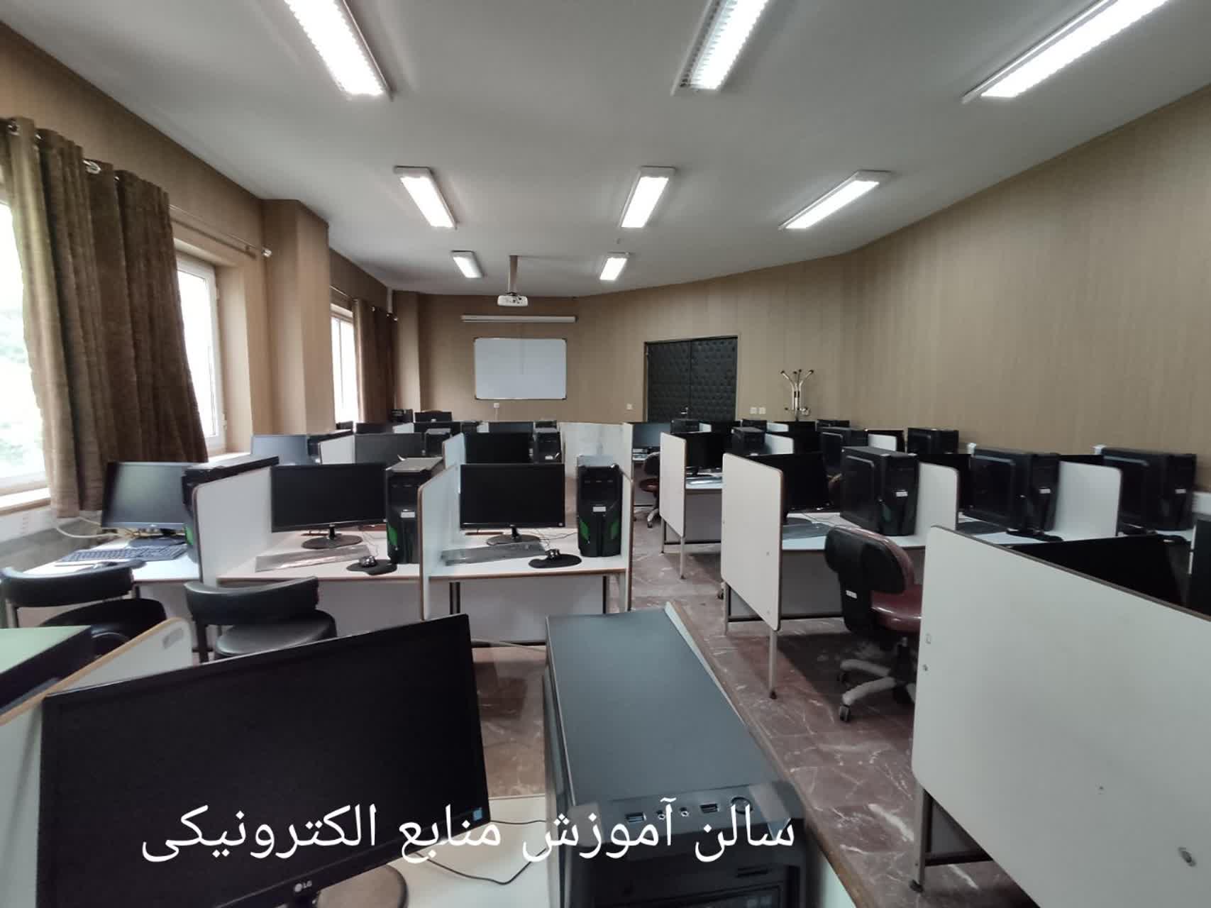 سالن آموزش منابع الکترونیکی دارای ۲۵ دستگاه کامپیوتر و تجهیزات و خدمات جانبی شامل ۲ دستگاه پروژکتور، پرینتر، اسکنر، دستگاه کپی، اسپیکر و پرده نمایش بوده و علاوه بر آن۲۰ دستگاه کامپیوتر نیز در سایت کتابخانه، واقع در طبقه اول کتابخانه جهت استفاده مراجعان وجود دارد.